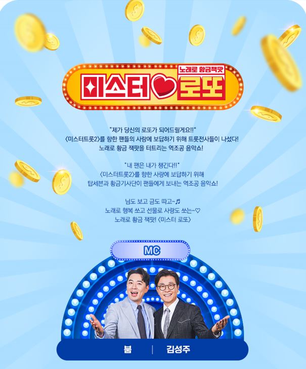 미스터 로또는 노래로 황금 잭팟이라는 취지로 미스터 트롯2 새로운 전설의 시작의 두 번째 스핀오프 프로그램입니다.